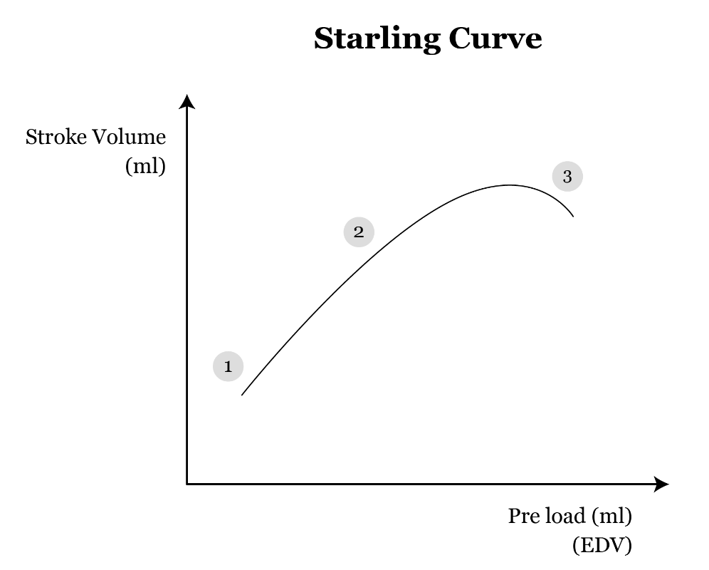 Why optimizing preload is important really comes down to the Frank Starling curve mechanism. This curve shows that as preload goes up, cardiac output or stroke volume also goes up due to the increased stretch on ventricular myocytes. So obviously, increasing preload can improve cardiac output for patients who are volume down (1 -> 2). However, there is a point of diminishing returns, where as you go up in volume, you are not going to get anymore increase in cardiac output, and can start driving symptoms of congestion or high intra-cardiac filling pressures (2 -> 3). This is why we diuresis to reduce preload, to try and get back to the ideal part of the starling curve (3 -> 2)